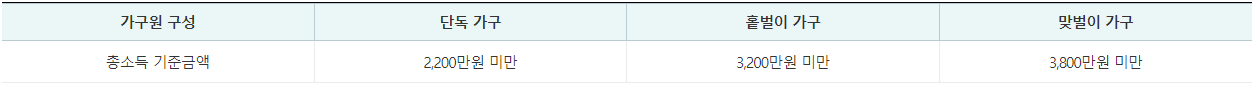 2023년 부부 합산 연간 총소득 합계액 및 2024년 부부합산 연간 근로소득 합계액이 가구원 구성에 따라 정한 아래 총소득 기준금액 미만이여야 가능합니다.