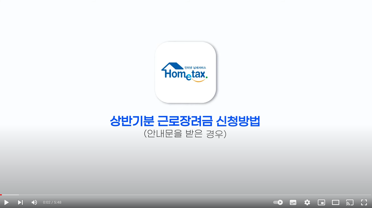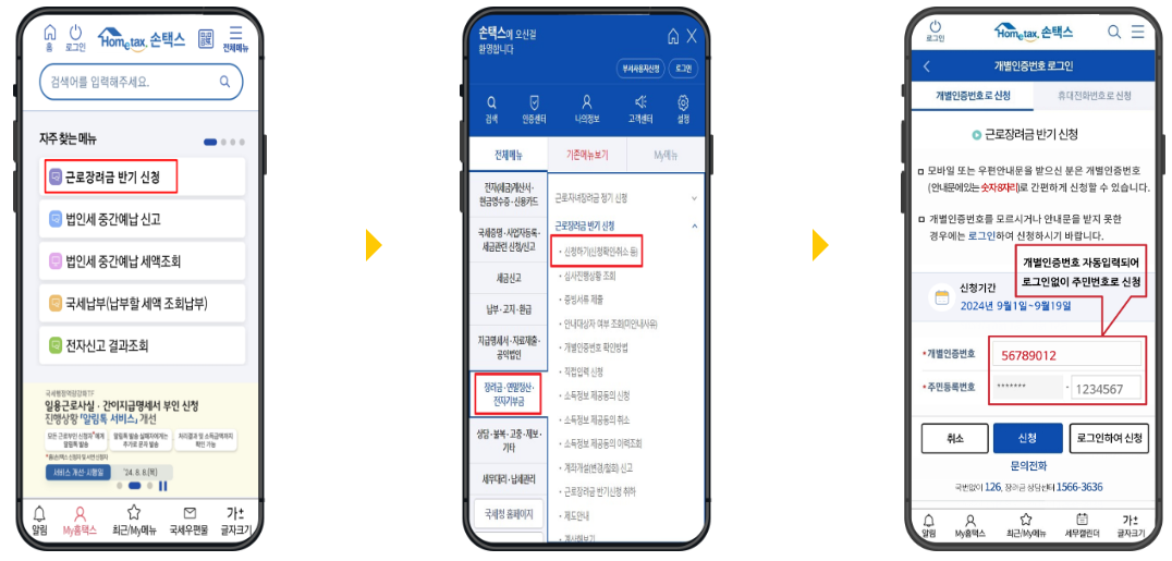 - 홈택스 접속 > 장려금, 연말정산, 전자기부금 > 근로장려금 반기 > 신청하기