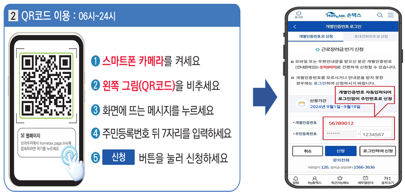 신청안내문에 있는 QR 코드 스캔 > 개별인증번호가 채워진 홈택스 모바일앱 신청화면으로 이동 > 로그인 없이 주민등록번호 7자리 입력 > 신청