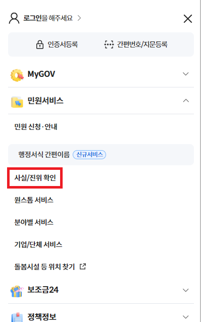 ✅ 상단 [민원 서비스] 클릭 > [사실/진위 확인 클릭]